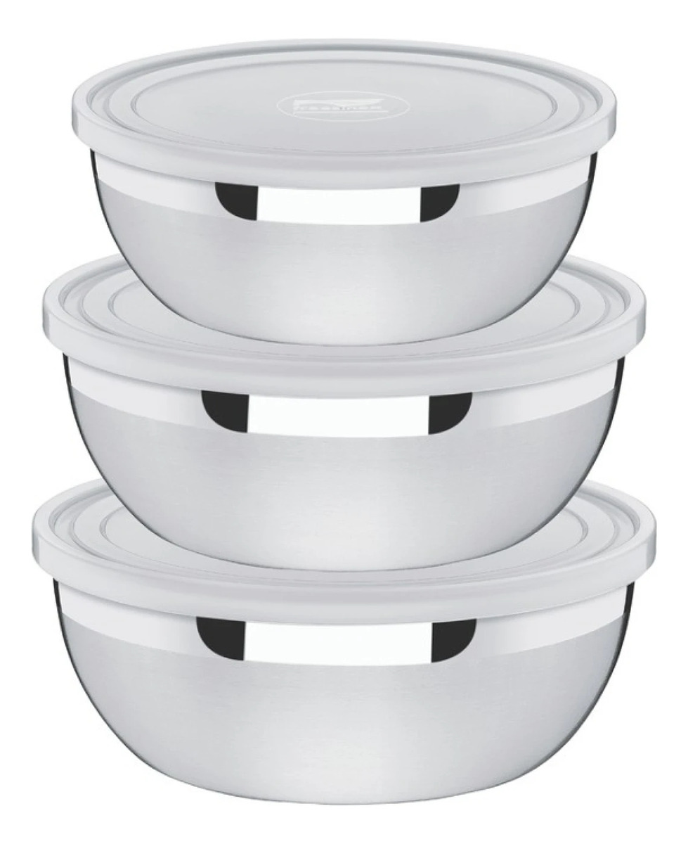 En acero inoxidable, tapa plástica. Terminación opaca con detalles brillantes. La tapa tiene sellado perfecto para una buena conservación de los alimentos. Puede llevarse a la heladera y al freezer. Medidas: 18 cm-1,6L 20cm-2,19L 22cm-2,90L