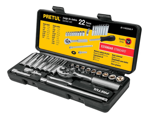 Ya sea que estés realizando reparaciones en casa, trabajando en un proyecto de construcción o simplemente buscando ampliar tu colección de herramientas, el Juego De Dados Standard Mas Accesorios Pretul Jd-1/4x22sae-p es una opción confiable y de alta calidad que satisfará todas tus necesidades.