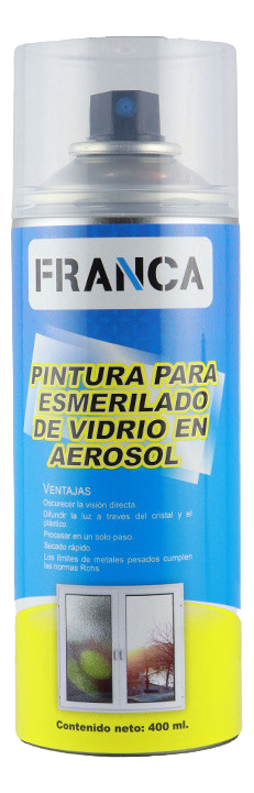 Transforma tus espacios con la Pintura Para Esmerilado De Vidrio En Aerosol 400ml de la marca Franca. Este esmalte de alta calidad está diseñado específicamente para aplicar sobre superficies de vidrio, brindando un acabado esmerilado que aporta elegancia y privacidad a tus ambientes. Su presentación en aerosol facilita la aplicación, permitiendo un control preciso y una cobertura uniforme.