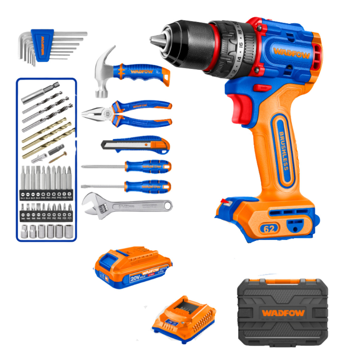 SET DE HERRAMIENTAS 91 PCS + TALADRO ATORN. C/ PERCUTOR 20V 62NM A BATERÍA + 2 BAT + CARGADOR + VALIJA