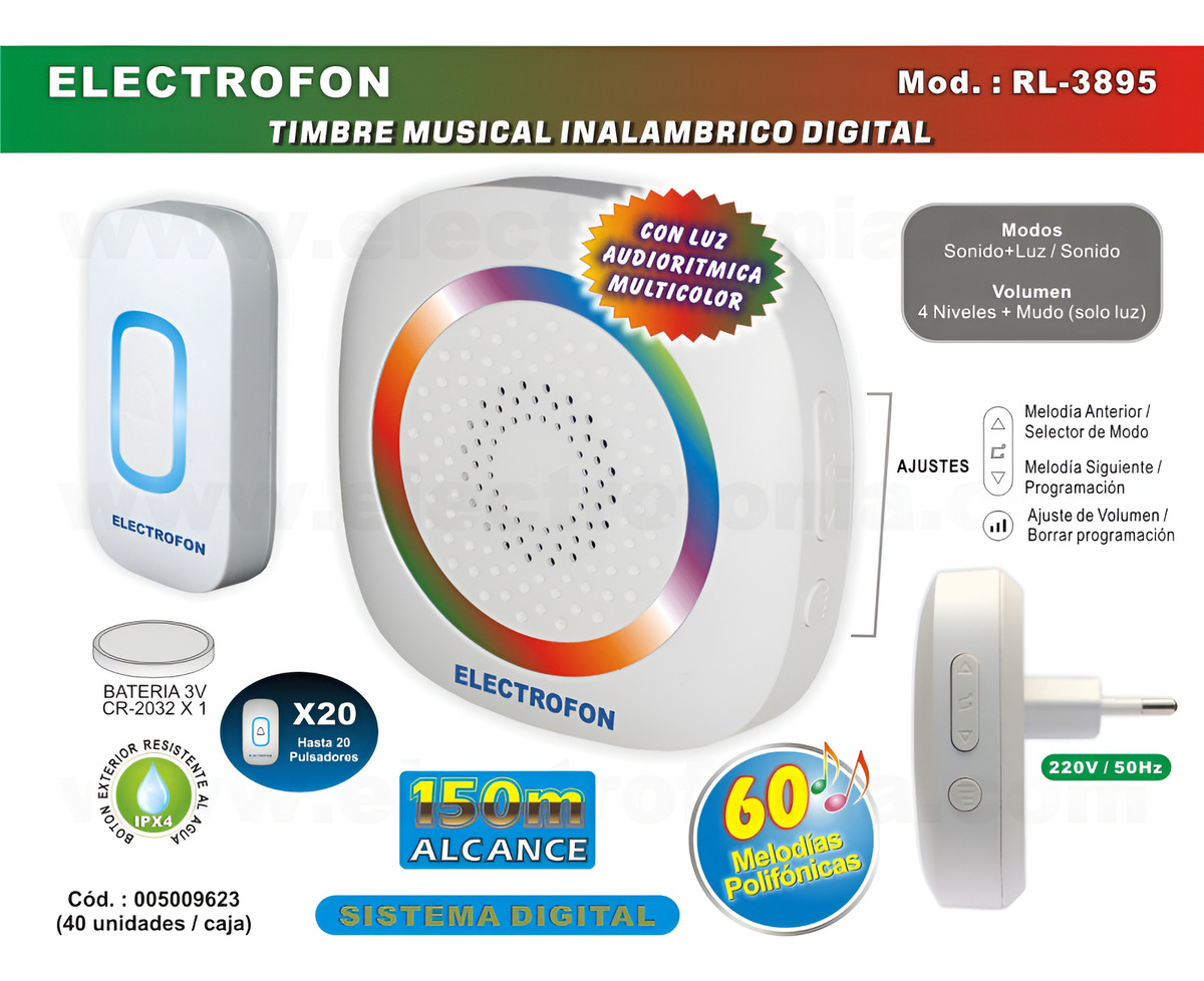 Descubre el timbre musical inalámbrico ELECTROFON RL-3895, una solución perfecta para quienes buscan funcionalidad y estilo en su hogar o negocio. Con una impresionante capacidad de 50 melodías, este timbre ofrece una variedad de opciones sonoras que se adaptan a tus preferencias, haciendo que cada visita sea especial.